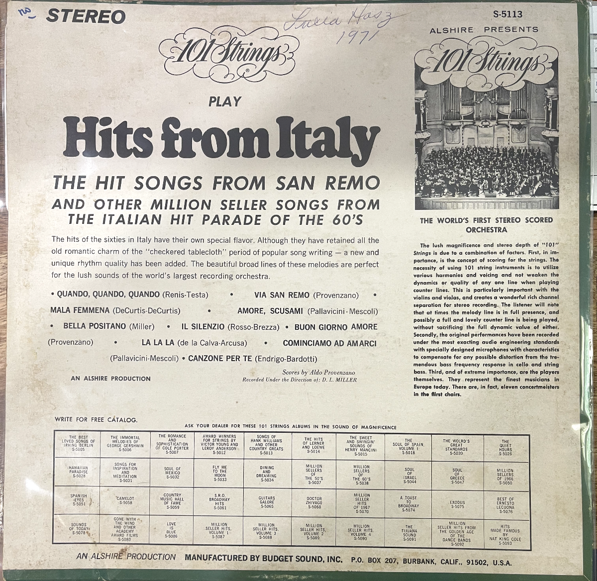 101 Strings — Million Seller Hits From Italy (Alshire S-5113) 12″ Vinyl LP