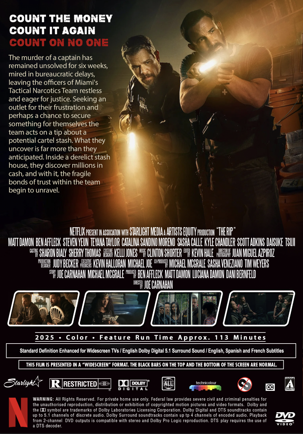 When a routine raid uncovers millions in hidden cash, a tight-knit team of Miami cops finds their loyalty tested and their trust shattered. What begins as a high-stakes bust spirals into paranoia, betrayal, and survival as each officer questions who they can rely on — and who might walk away with everything. Gritty, intense, and morally charged, The Rip delivers explosive action and razor-sharp suspense from start to finish.