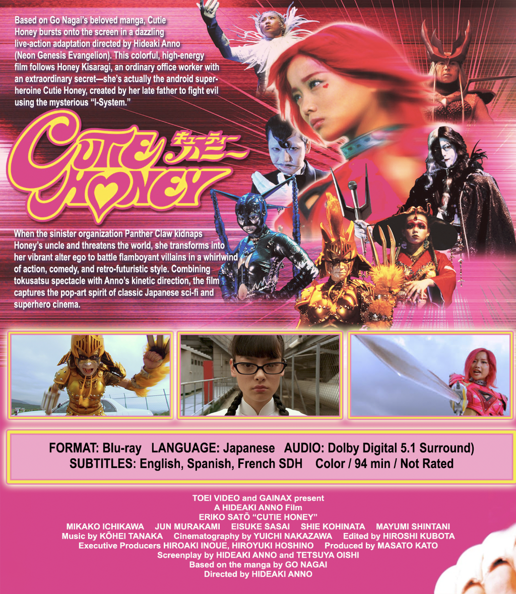 Hideaki Anno’s (Neon Genesis Evangelion) vibrant live-action take on Go Nagai’s cult manga Cutie Honey explodes with color, camp, and kinetic energy. Eriko Sato stars as Honey Kisaragi, a kindhearted office worker who secretly lives as the android superheroine Cutie Honey — a creation of her late scientist father and powered by the revolutionary “I-System.”