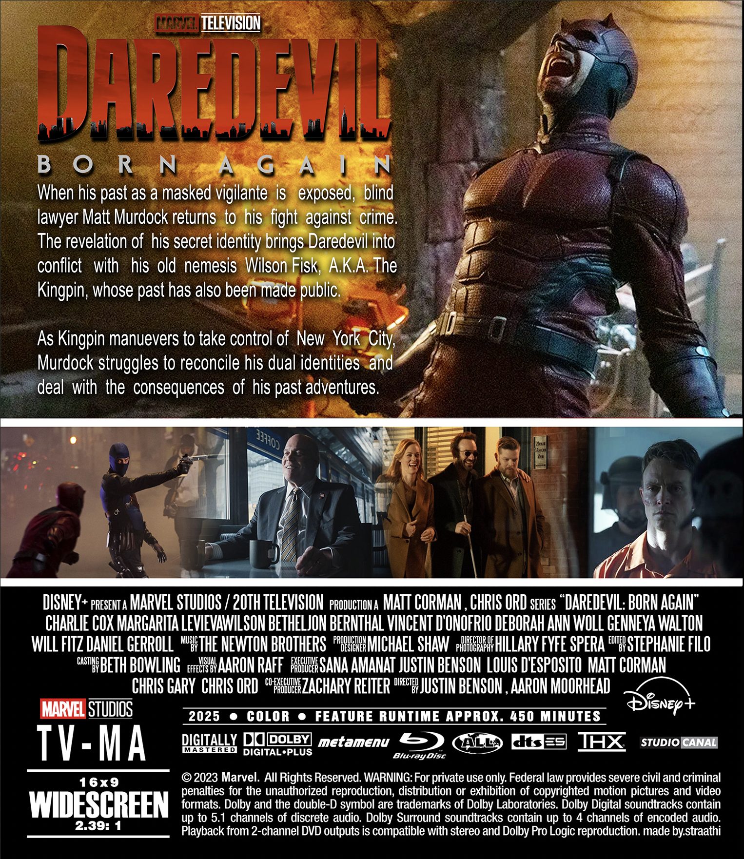 Daredevil Born Again Season One (Blu-ray) All-region import. Includes case, cover and discs. 1080p HD Video. Interactive menus. Dolby Digital 5.1 Surround. English subtitles.