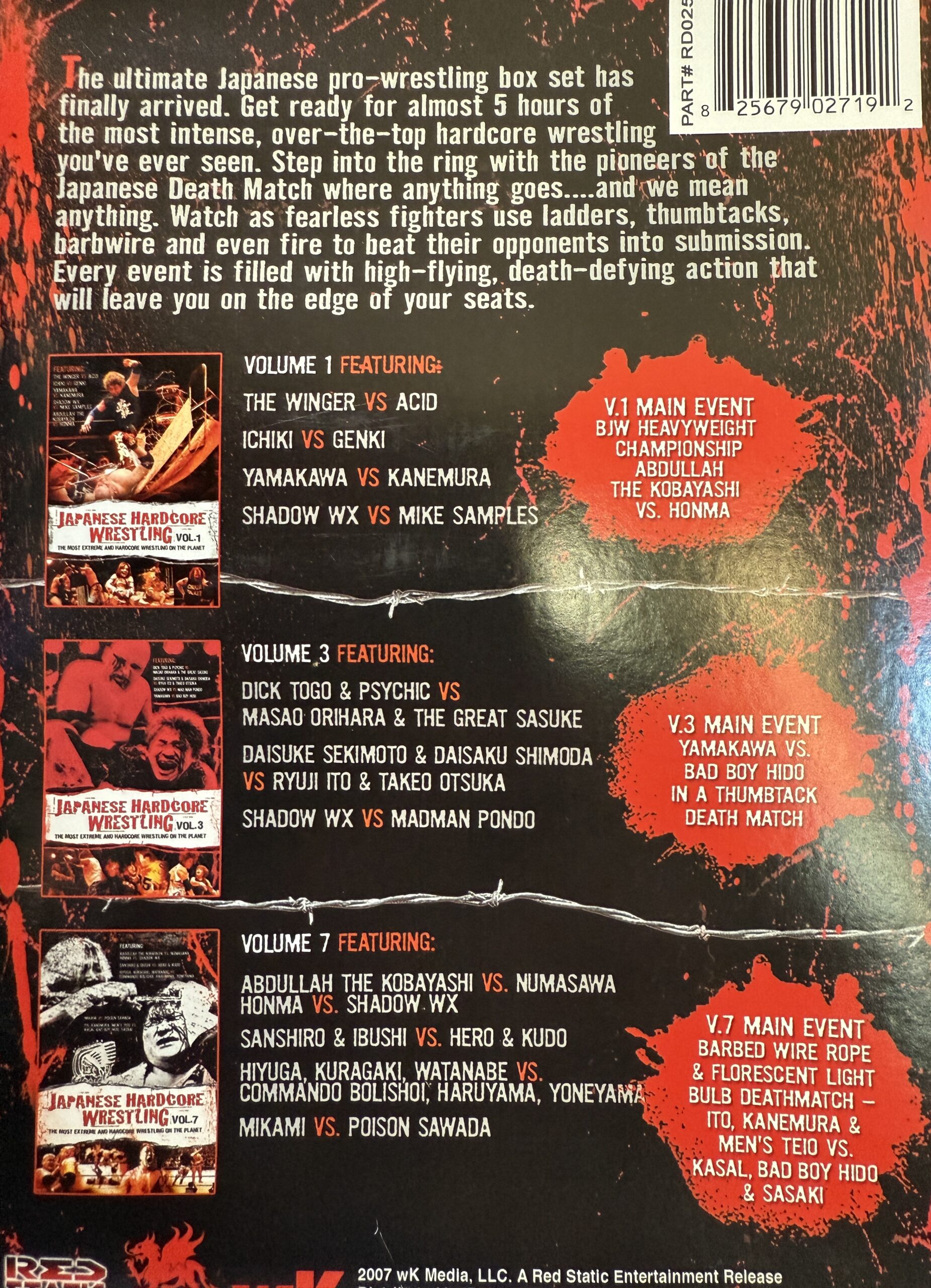 This extreme wrestling compilation unleashes the most brutal matches from Japan’s underground circuit, featuring the blood-soaked chaos of Volumes 1, 3, and 7. Hardcore icons like Jun Kasai, Masashi Takeda, and Ryuji Ito push the limits of pain and endurance in a nonstop barrage of barbed wire, glass, and fire matches. An unflinching showcase of Japan’s most intense deathmatch legends.
