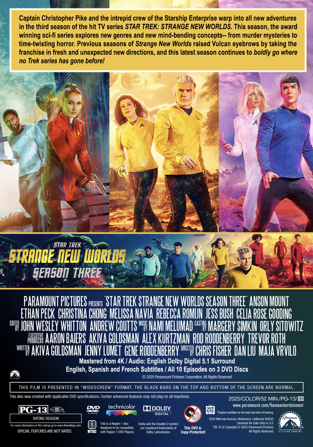 Star Trek Strange New Worlds Season 3 (DVD) 3-Disc Set. Includes case, cover art and 3 DVDs. High quality materials and good production values. Interactive menus. Presented in Dolby Digital 5.1 Surround.